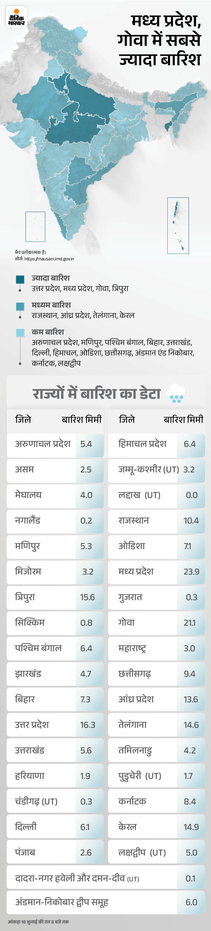 मौसम विभाग के आंकड़ों के मुताबिक 1 जून से 16 जुलाई तक देश में 331.9mm बारिश रिकॉर्ड की गई है। यह सामान्य 304.2mm से करीब 9% ज्यादा है।