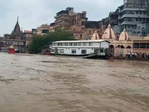 उत्तर प्रदेश: वाराणसी में उफनती गंगा नदी में घाट पर बने मंदिर डूब गए हैं।