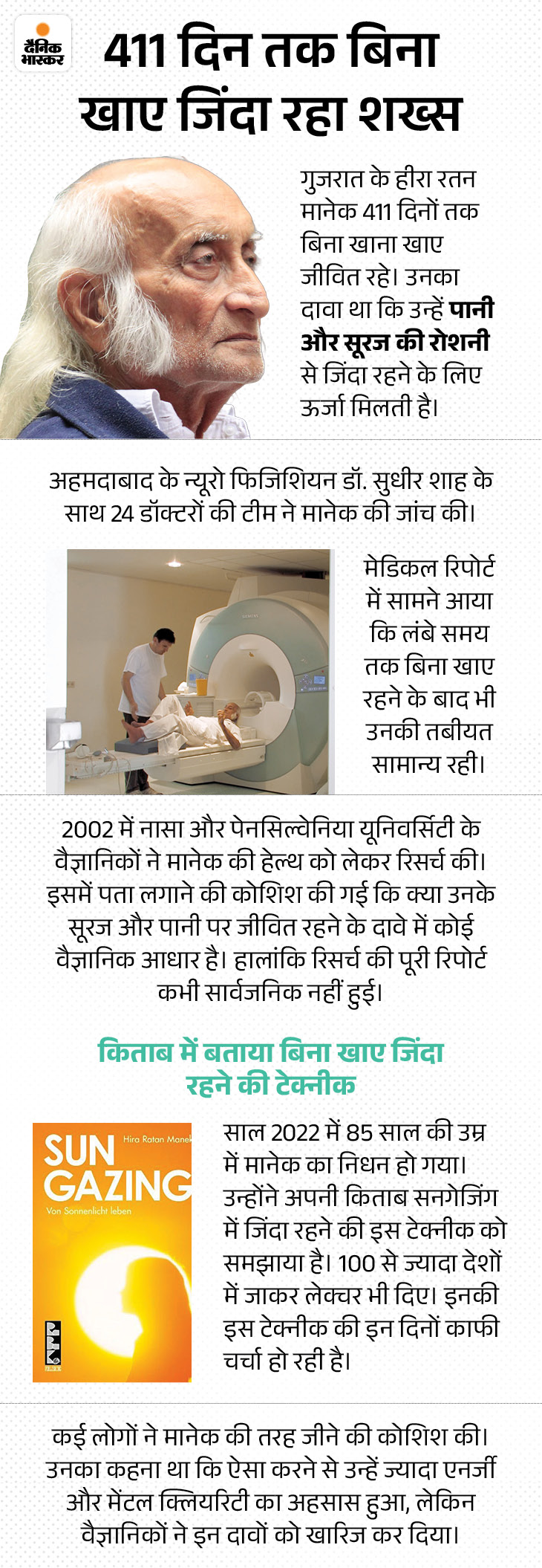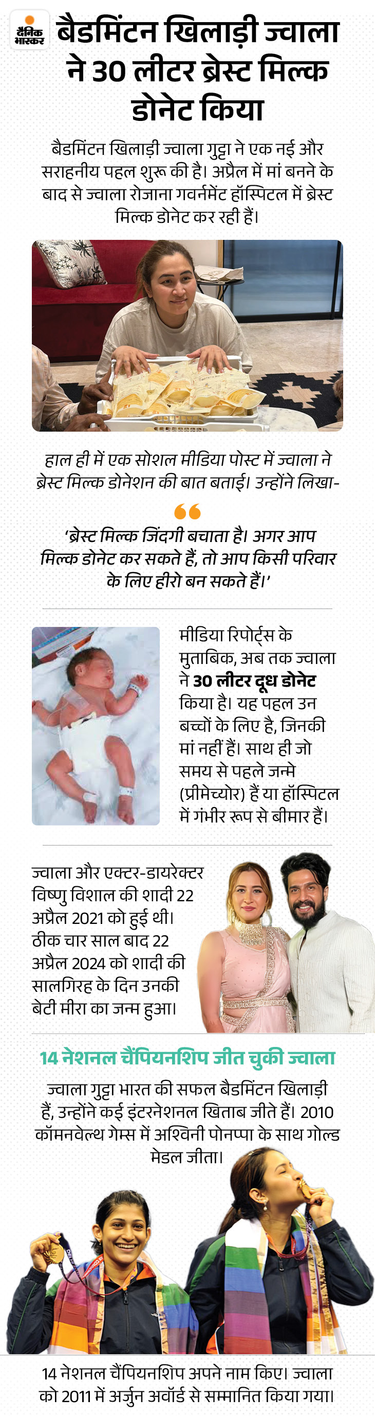 इंडियन बैडमिंटन स्टार ज्वाला गुट्टा मां बनने के बाद 4 महीने से रोजाना ब्रेस्ट मिल्क डोनेट कर रहीं हैं। वहीं, गुजरात के हीरा रतन मानेक 1 साल 46 दिनों तक बिना खाए सूरज की रोशनी पर जिंदा रहे।