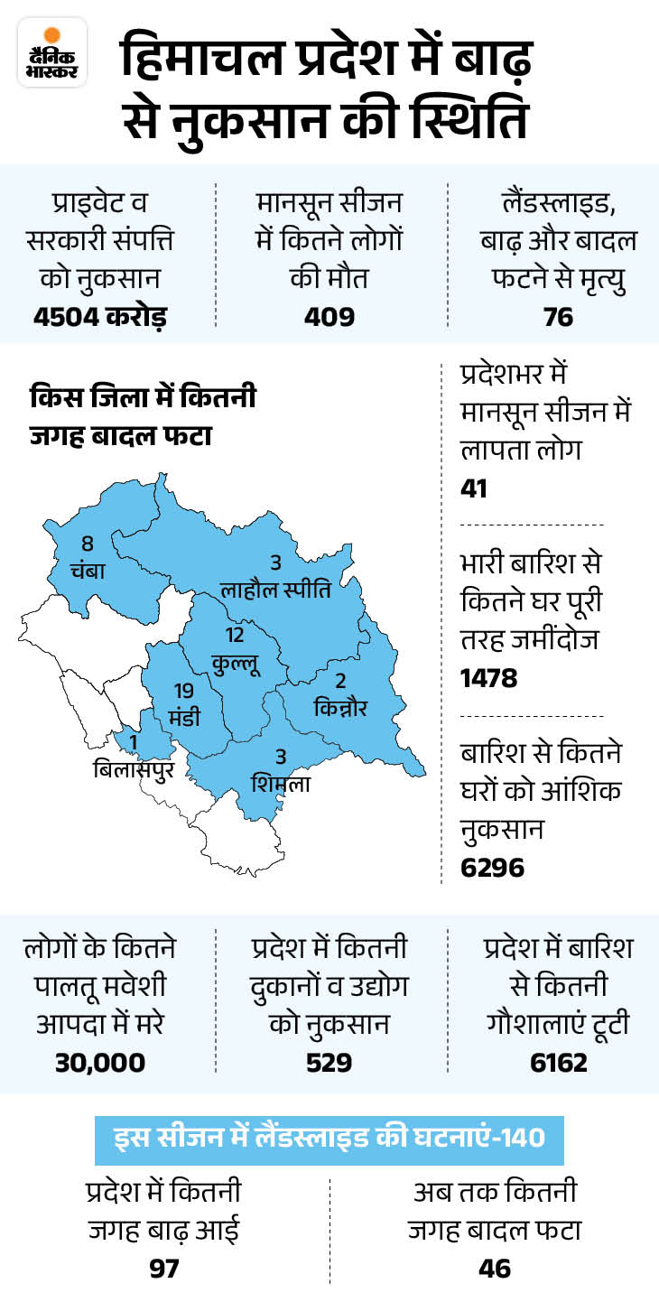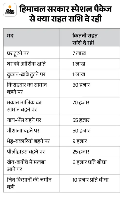 बता दें कि, पीएम मोदी ने 9 सितंबर को हिमाचल के कुल्लू, मंडी और चंबा का हवाई सर्वेक्षण कर बाढ़ और लैंडस्लाइड से हुए नुकसान का जायजा लिया था। PM ने कांगड़ा में बैठक में अधिकारियों से प्रेजेंटेशन लिया और 1500 करोड़ रुपए की मदद का ऐलान किया। मगर, अब तक इस पैकेज को लेकर केंद्र सरकार ने कोई नोटिफिकेशन जारी नहीं की।