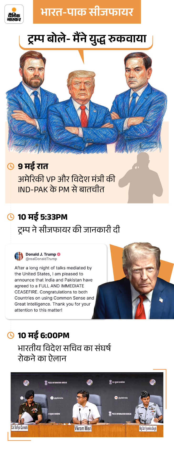 ट्रम्प ने 10 मई को सबसे पहले दोनों देशों में सीजफायर जानकारी दी थी, जिसके बाद से वे करीब 30 से ज्यादा बार सीजफायर क्रेडिट ले चुके हैं। हालांकि, भारत साफ तौर पर कह चुका हैं कि सीजफायर आपसी बातचीत से हुआ है, इसमें किसी तीसरे पक्ष का कोई रोल नहीं है।