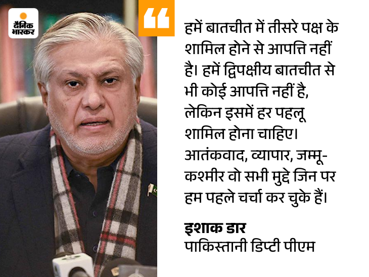 डार ने कहा- भारत का कहना है कि यह एक द्विपक्षीय मुद्दा है। हम किसी चीज की भीख नहीं मांग रहे हैं। लेकिन बातचीत के लिए दो लोगों की जरूरत होती है। डार ने यह भी कहा कि अगर भारत जवाब देता है तो पाकिस्तान अभी भी बातचीत के लिए तैयार है।
