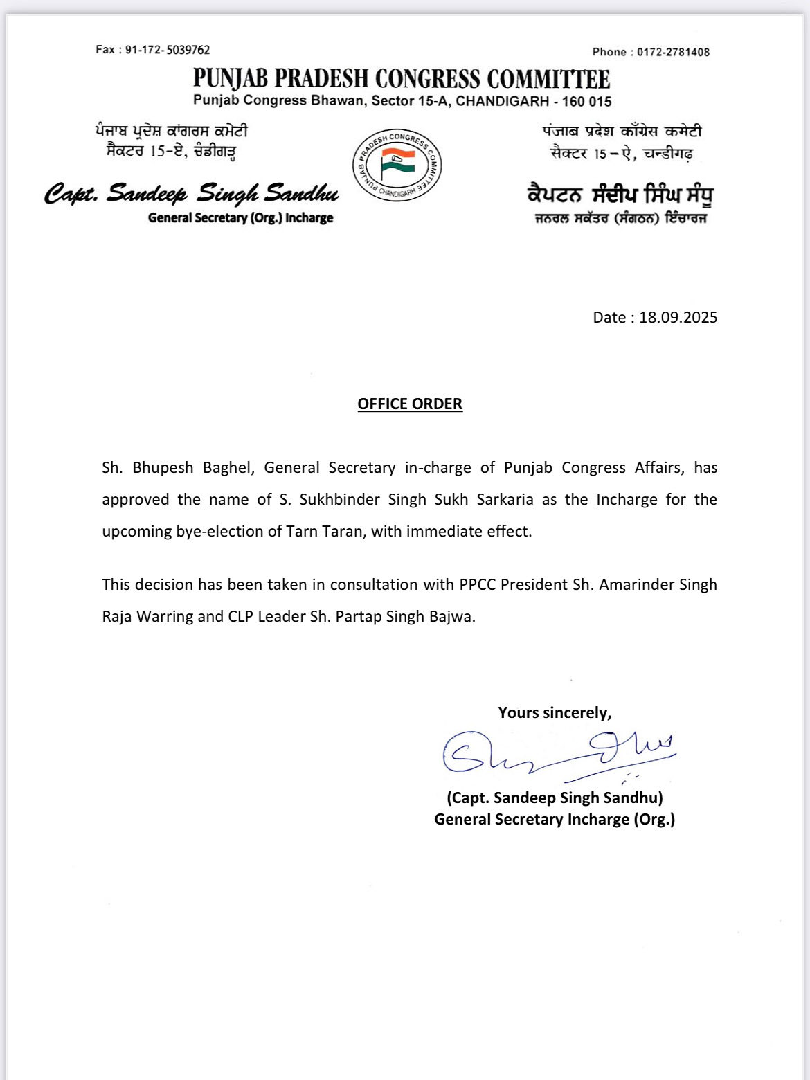 पंजाब कांग्रेस के इंचार्ज और अखिल भारतीय कांग्रेस कमेटी (AICC) के महासचिव भूपेश बघेल ने तरनतारन में होने वाले आगामी उपचुनाव के लिए सुखबिंदर सिंह सुख सरकारिया को इंचार्ज नियुक्त करने की मंजूरी दे दी है। यह निर्णय तत्काल प्रभाव से लागू होगा। यह फैसला प
