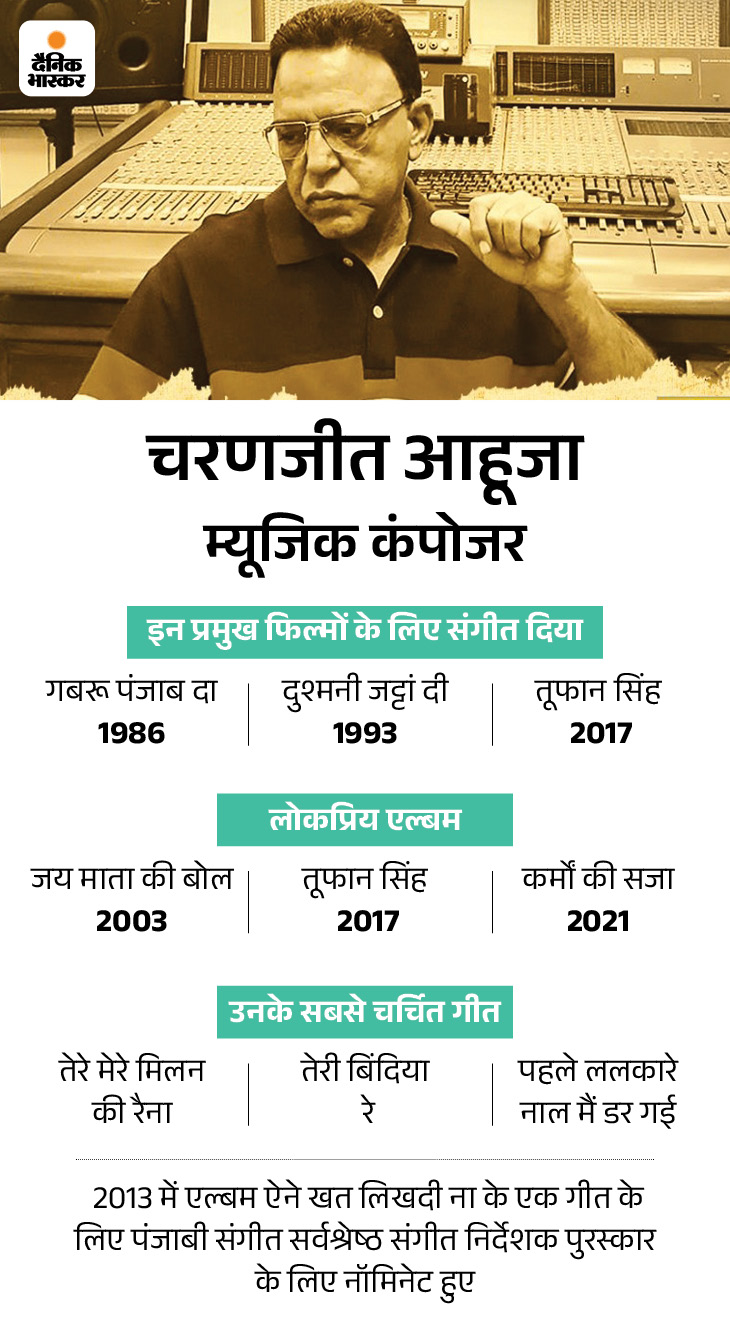 पंजाब के संगीतकार चरणजीत सिंह आहूजा का आज निधन हो गया। उन्होंने मोहाली में घर पर अंतिम सांस ली। वह 74 साल के थे और कुछ वर्षों से कैंसर से लड़ रहे थे, जिसका इलाज चंडीगढ़ पीजीआई से चल रहा था। उनका अंतिम संस्कार सोमवार दोपहर 1 बजे मोहाली के श्मशान घाट में