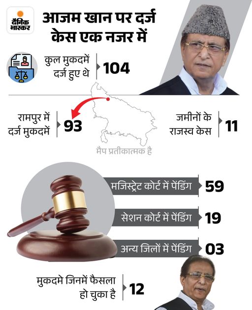 आजम के खिलाफ कुल 104 मुकदमे दर्ज हैं। इसमें अकेले रामपुर में 93 मामले दर्ज हैं, बाकी दूसरे जिलों में दर्ज हैं। 12 मुकदमों में फैसला आ चुका है। कुछ में सजा हुई है और कुछ में वे बरी हो गए हैं। लगभग सभी मामलों में उन्हें जमानत मिल चुकी है।