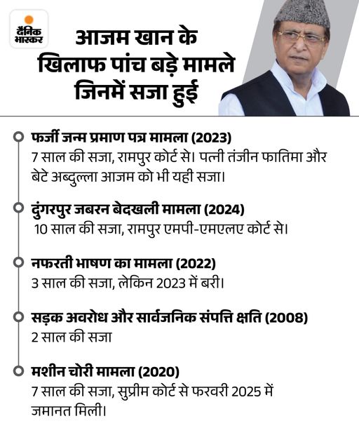 आजम के खिलाफ 104 मुकदमे दर्ज हैं। इसमें अकेले रामपुर में 93 मामले दर्ज हैं। सभी मामलों में उन्हें जमानत मिल चुकी है। 2022 में भड़काऊ भाषण देने के एक मामले में अदालत ने दो साल की सजा सुनाई थी। इसके बाद आजम की विधायकी चली गई थी।