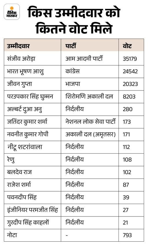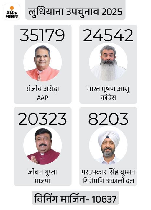 19 जून को हुआ मतदान हलका पश्चिमी में 19 जून को वोटिंग के लिए 194 मतदान केंद्र बनाए गए थे। चुनाव आयोग की ओर से जारी आंकड़ों के मुताबिक, शाम 7 बजे तक 51.33% वोटिंग हुई थी। इस सीट पर 2022 में आम आदमी पार्टी (AAP) के उम्मीदवार गुरप्रीत गोगी की जीत हुई थी। हालांकि, कुछ समय पहले उनकी गोली लगने से मौत हो गई, जिसके बाद यहां उपचुनाव कराया गया था। AAP ने यहां से राज्यसभा सांसद संजीव अरोड़ा को उम्मीदवार बनाया था।