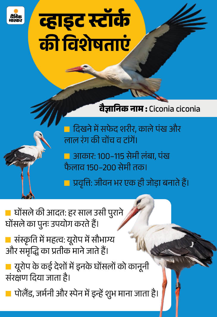 व्हाइट स्टॉर्क एक नजर में धोलिया गांव में दर्ज हुआ व्हाइट स्टॉर्क का झुंड जैसलमेर की पारिस्थिति की और प्रवासी पक्षियों की दुनिया में एक अहम घटना है। यह न केवल स्थानीय लोगों और वैज्ञानिकों के लिए गौरव की बात है, बल्कि इस बात का संकेत भी है कि मरुस्थलीय पारिस्थितिकी तंत्र अभी भी प्रवासी पक्षियों के लिए सुरक्षित और आकर्षक है। जैसलमेर में सर्दियों की शुरुआत के साथ अब परिंदों का यह कारवां लगातार बढ़ेगा। आने वाले महीनों में आसमान डेमोइसेल क्रेन के कलरव से गूंजेगा, तालाब फ्लेमिंगो से गुलाबी हो जाएंगे और रेगिस्तान प्रवासी परिंदों की उड़ानों से जीवंत हो उठेगा।