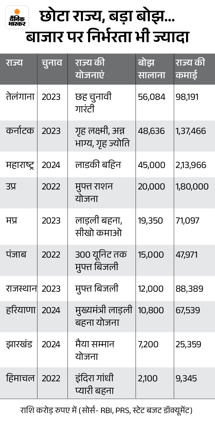 2024-25 में जिन बड़े राज्यों में उधारी बढ़ी, उनमें मध्य प्रदेश टॉप पर है। कमाई का 42% वेतन-भत्ते, ब्याज, 27% मुफ्त की योजना में जा रहा है। छत्तीसगढ़ में खुद की कमाई की 18% राशि वादे पूरे करने पर खर्च हो रही है। स्वास्थ्य पर खर्च घटा है।