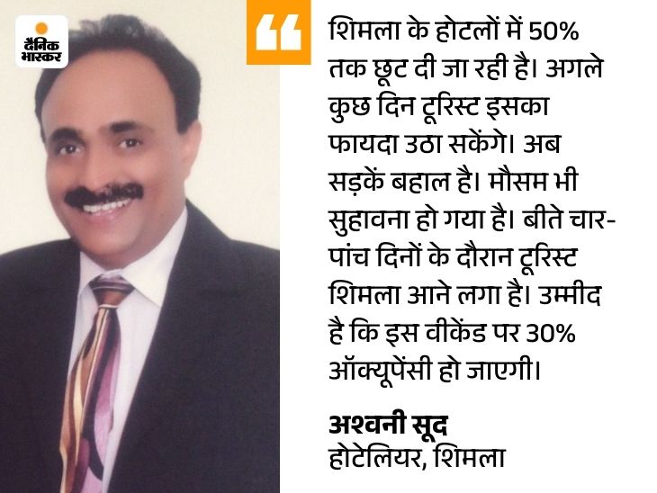प्रदेश में लगभग साढ़े तीन महीने के अंतराल के बाद टूरिस्ट पहाड़ों पर पहुंचना शुरू हुआ है। पर्यटन स्थलों पर इससे रौनक लौटनी शुरू हो गई है। शिमला व आसपास के होटलों में 15 से 20 फीसदी ऑक्यूपेंसी हो चुकी है। वीकेंड पर इसके 35 प्रतिशत होने का अनुमान है।