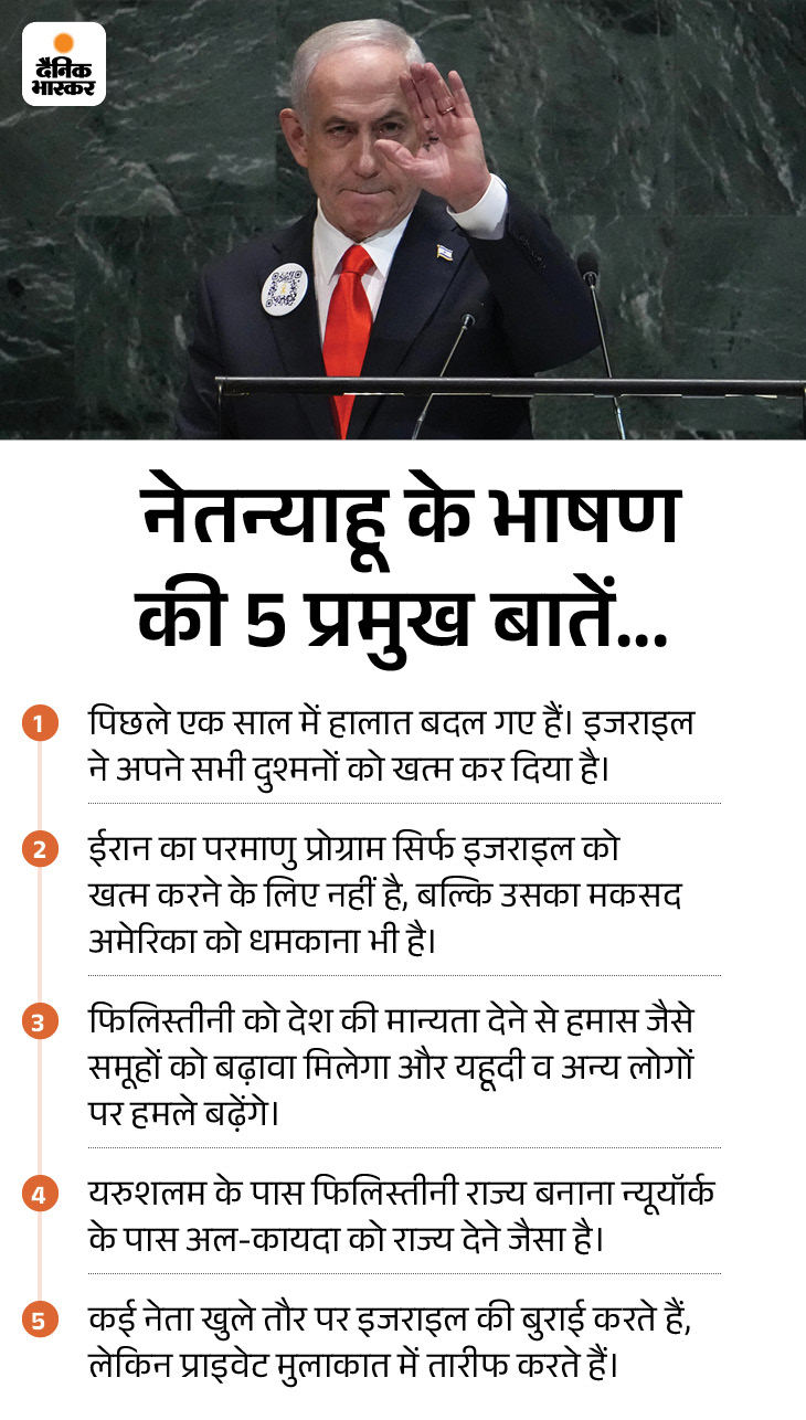 नेतन्याहू ने कहा कि जब वे पिछली बार UN में खड़े हुए थे, तब ईरान अपने परमाणु और मिसाइल कार्यक्रम को तेजी से आगे बढ़ा रहा था और उसके समर्थक हमास और हिजबुल्लाह, इजराइल को लगातार निशाना बना रहे थे। लेकिन अब इजराइल इन खतरों को मिटा चुका है।