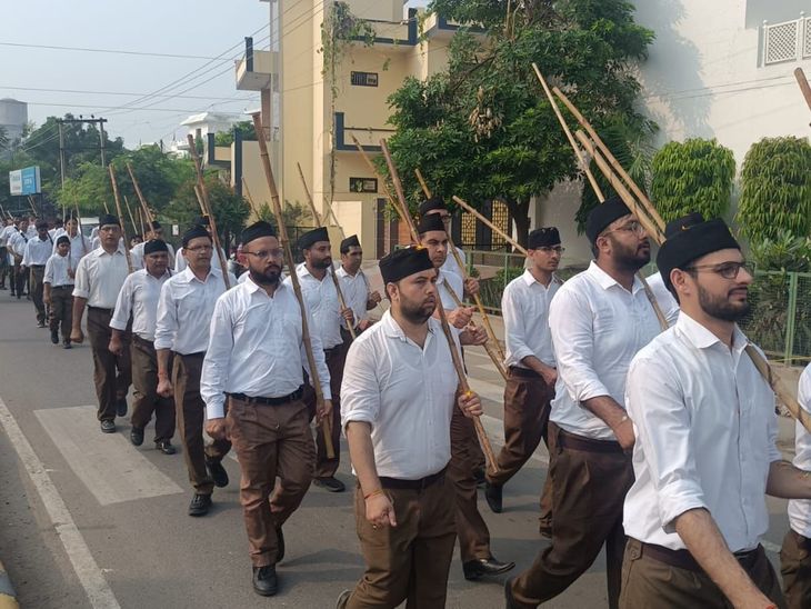 हिसार के सेक्टर 14 में दशहरा उत्सव के दौरान पथ संचलन निकालते संघ के स्वयंसेवक।