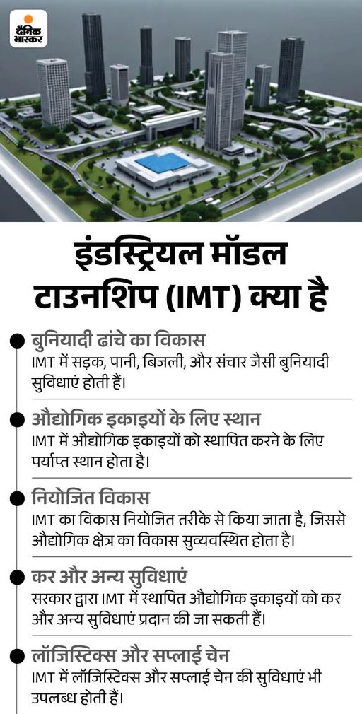 - फरीदाबाद-पलवल में होंगी दो IMT : फरीदाबाद में 2 IMT बनाने की योजना है। दोनों जगह करीब 13 हजार एकड़ जमीन की जरूरत होगी। पहली 4500 एकड़ में बनेगी। जिसमें खेड़ी कलां, नचोली, ताजपुर, धनकौला, शाहबाद, ताजापुर, बदरपुर सेद, साहुपुरा, सोताई, सुनपर, मलेरना, जाजरू, भैंसरावली, फतुपुरा, बुआपुर, जसाना, फरीदपुर, सदपुरा, तिगांव सेक्टर : 94ए, 96, 96, 97ए, 99, 100, 101, 102, 103, 140, 141 व 142 शामिल हैं। दूसरी IMT के लिए फरीदाबाद और पलवल में 9 हजार एकड़ जमीन की जरूरत होगी। इनमें छैंसा, मोहीयापुर, मोहना, बागपुर कलां, बागपुर खुर्द, बहरौला, हंसपुर, सोलरा, थंथरी इलाके शामिल हैं। ये टाउनशिप जेवर एयरपोर्ट से जुड़ने वाले नेशनल हाईवे के किनारे होगी।