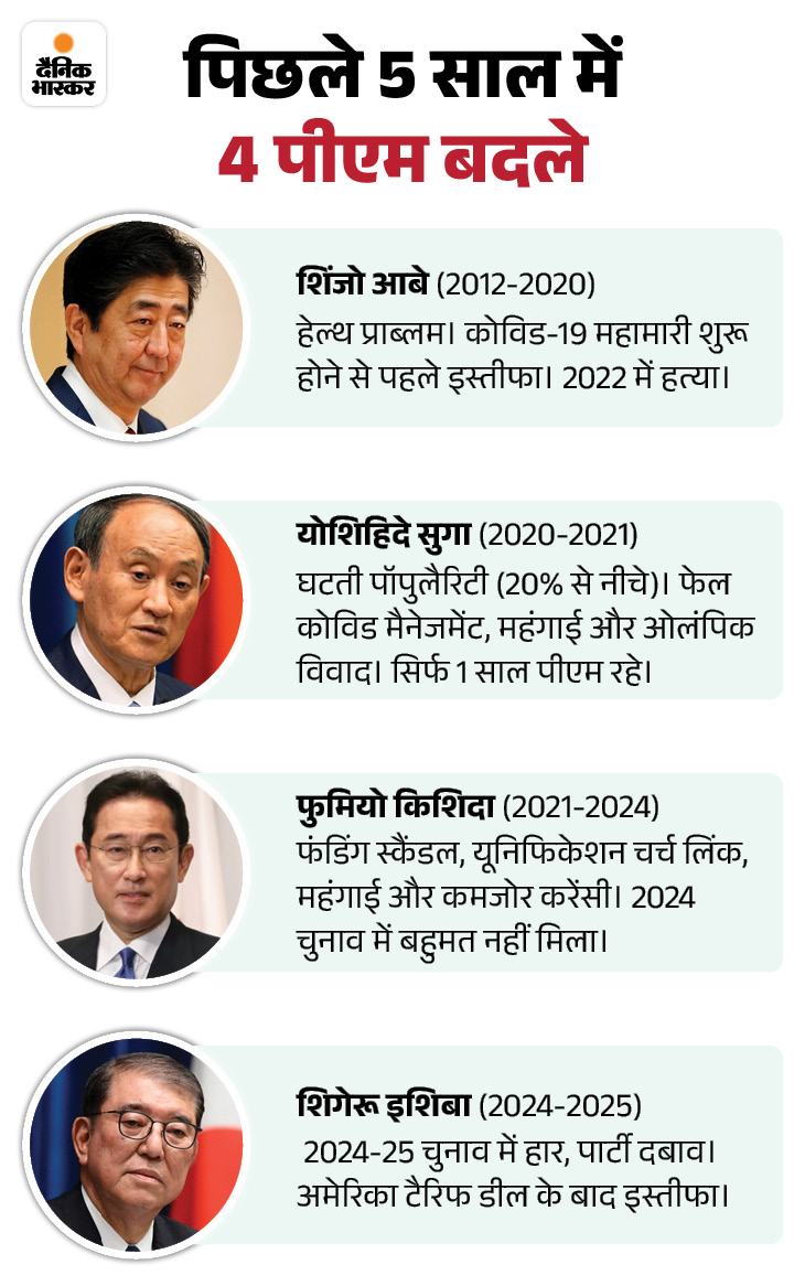 शिगेरू इशिबा सितंबर 2024 में पीएम बने थे। वे पार्टी में ‘आउटसाइडर’ थे, यानी उनका कोई गॉडफादर नहीं था। उन्होंने वादा किया था कि महंगाई और आर्थिक समस्याओं को ठीक करेंगे, लेकिन उनका समय मुश्किल भरा रहा।