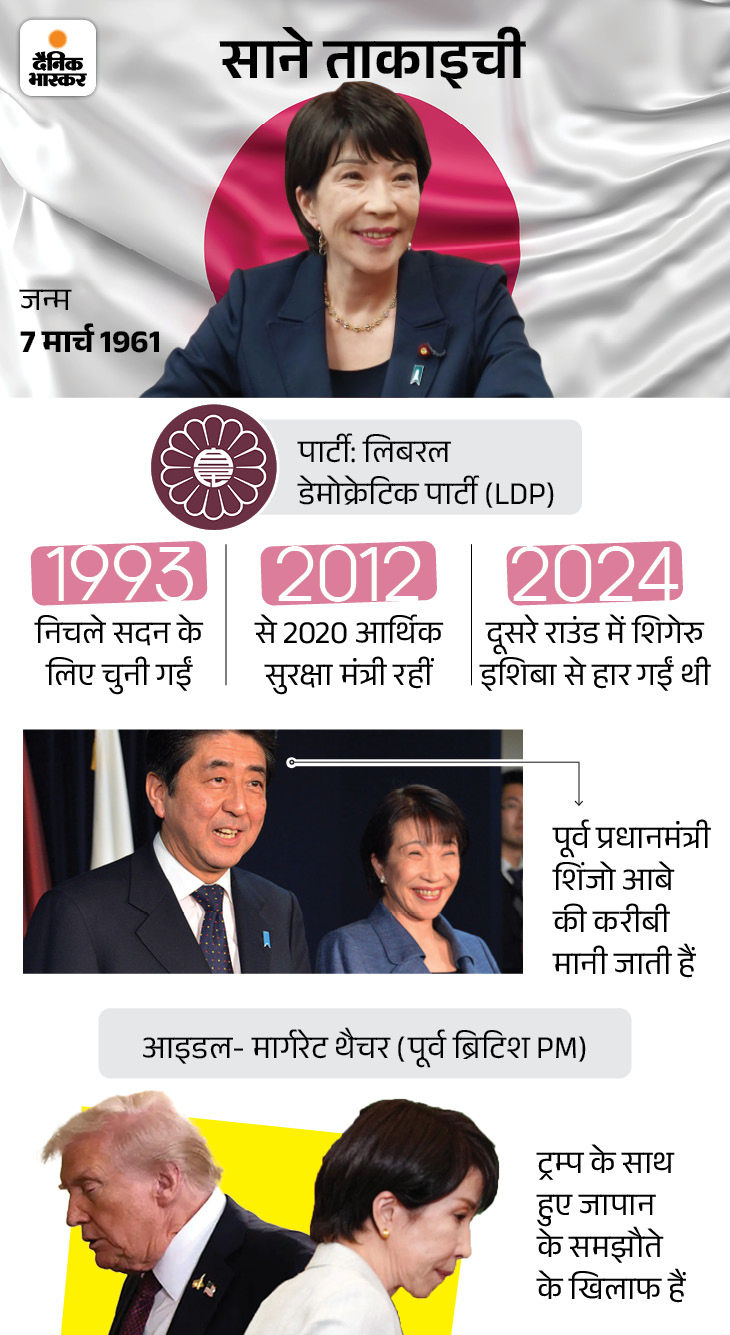 - ताकाइची हाल ही में ट्रम्प प्रशासन के साथ हुए ट्रेड डील के खिलाफ हैं। उन्होंने कहा कि इस पर फिर से बातचीत की जानी चाहिए।