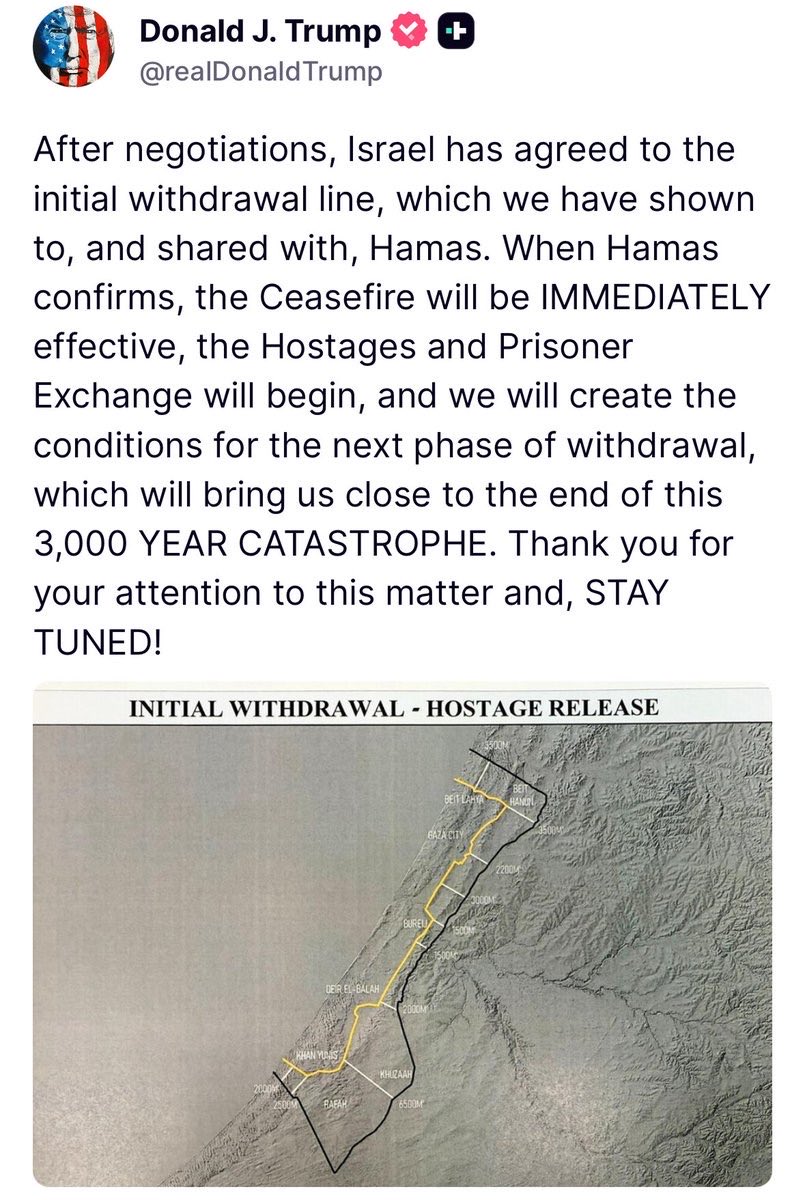 अमेरिकी राष्ट्रपति डोनाल्ड ट्रम्प ने शनिवार को कहा कि इजराइल ने गाजा से पीछे हटने के लिए शुरुआती सीमा रेखा (Initial Withdrawal Line) के लिए सहमति जताई है।