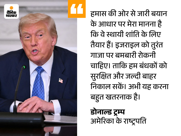 इससे पहले ट्रम्प ने हमास को शांति प्रस्ताव जल्द से जल्द मानने की धमकी दी थी। उन्होंने कहा था कि अगर हमास ने लड़ाई जारी रखी तो उसके सभी विकल्प खत्म हो जाएंगे।