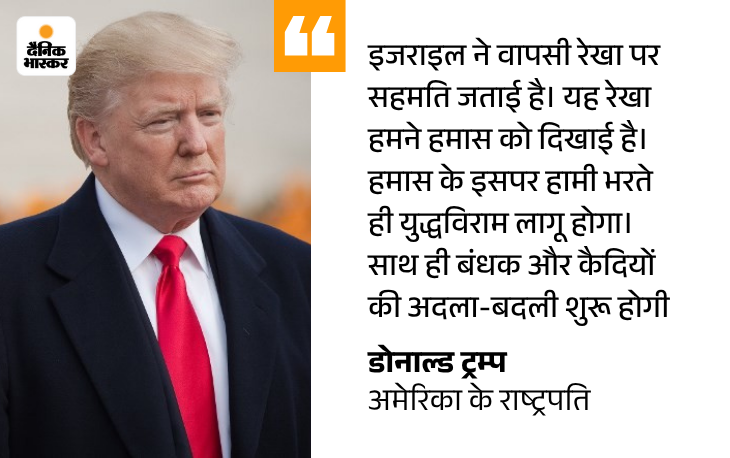 ट्रम्प के मैप के मुताबिक, यह शुरुआती वापसी रेखा गाजा स्ट्रिप में इजराइली सेना (IDF) की उन पुरानी कंट्रोल लाइनों को दिखाती है, जो पिछले महीने गाजा सिटी के बड़े हमले से पहले थीं। फिलहाल IDF का गाजा के करीब 70% इलाके पर कब्जा है।