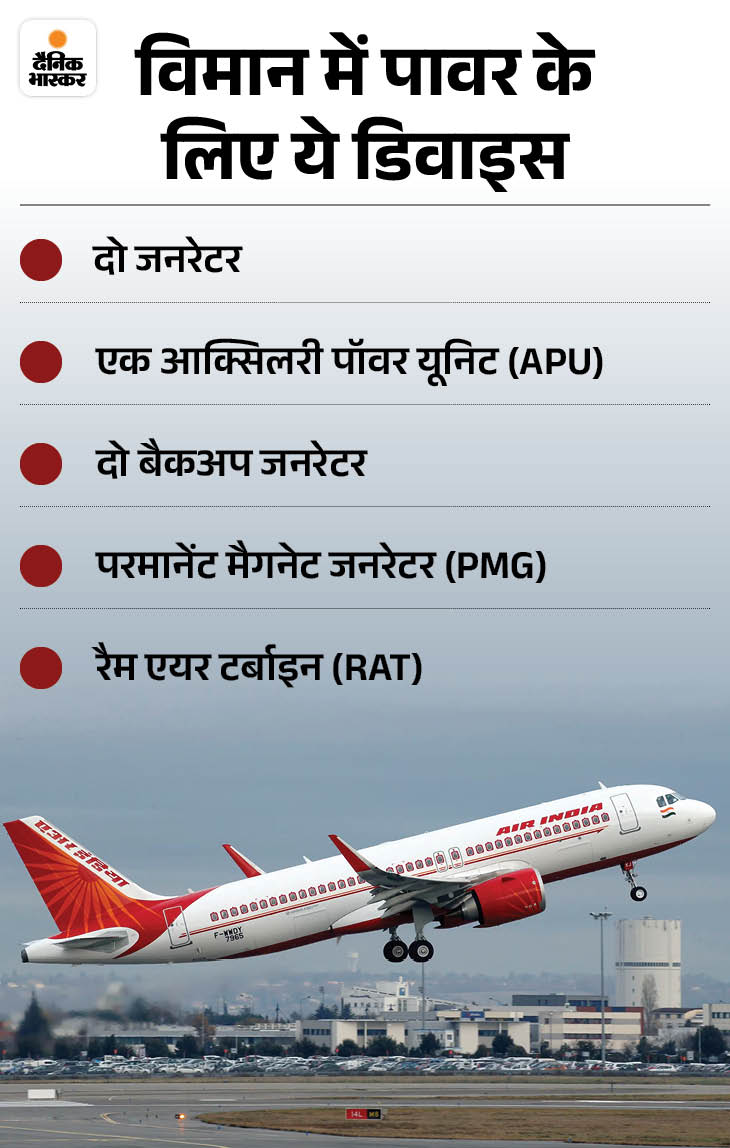 - किसी विमान के मुख्य दो जनरेटर खराब हो जाएं, तो APU जनरेटर चालू हो जाता है। अगर इन तीनों में से कोई भी जनरेटर चालू हो, तो भी फ्लाइट को पूरी बिजली मिल सकती है। इसके बावजूद तीनों मुख्य जनरेटर फेल जाएं तो भी हर इंजन में एक बैकअप जनरेटर होता है। ये बैकअप जनरेटर विमान के सिस्टम को एसी (अल्टरनेटिंग करंट) पावर देते हैं, इससे इंजन चलते रहते हैं।