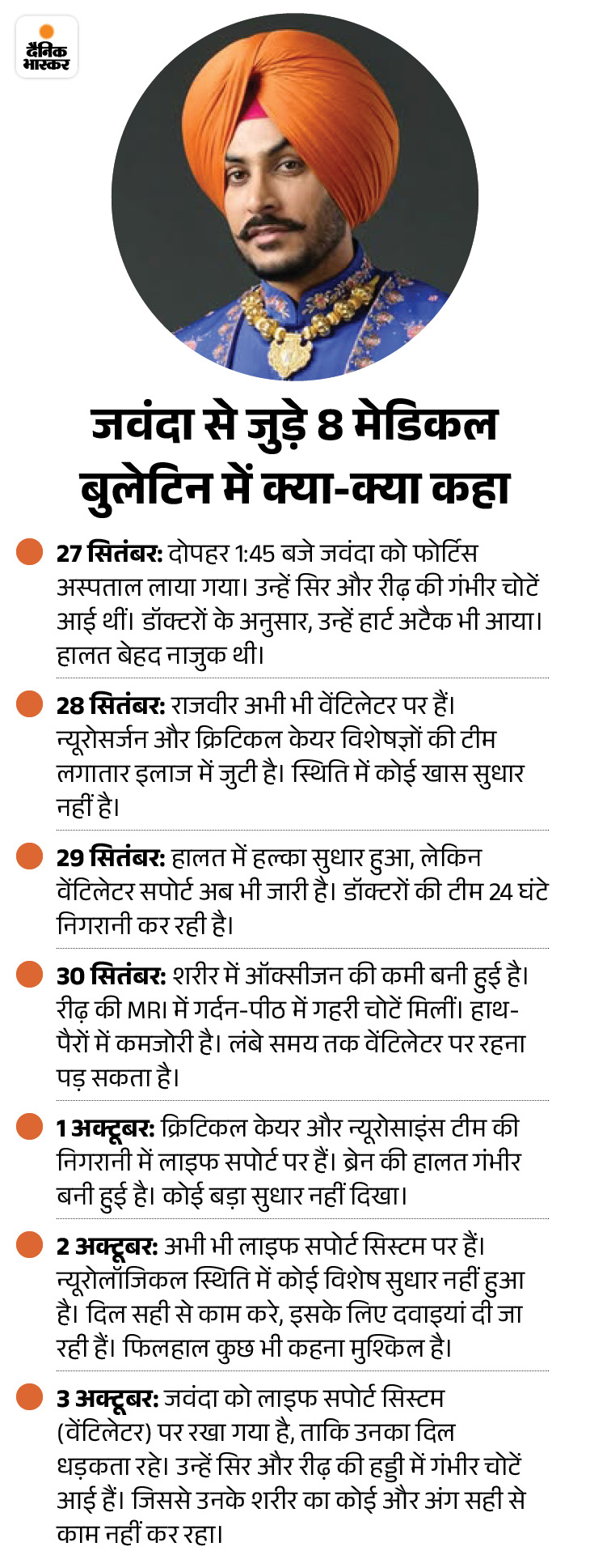 पंजाबी सिंगर राजवीर जवंदा की हालत में 10 दिन बीत जाने के बाद भी कोई खास सुधार नहीं है। वे इस समय मोहाली के फोर्टिस अस्पताल में वेंटिलेटर पर हैं। दूसरी तरफ, पूरे पंजाब में उनके फैन्स और परिवार वाले उनकी सलामती के लिए अरदास कर रहे हैं।