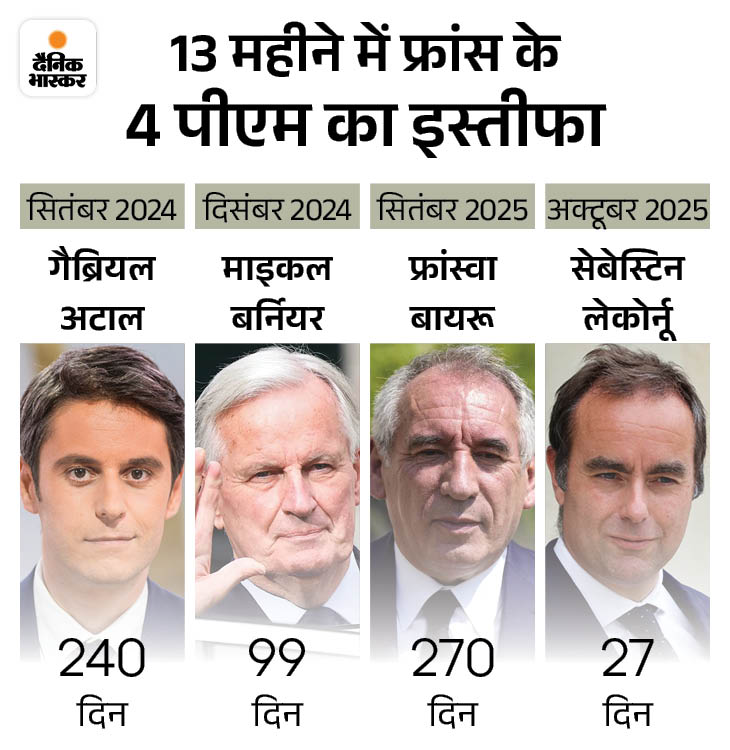 फ्रांस के पीएम सेबेस्टियन लेकोर्नू ने महज 27 दिन में इस्तीफा दे दिया है। उन्होंने 9 सितंबर को प्रधानमंत्री का पद संभाला था, 6 अक्टूबर को उन्होंने इस्तीफा दे दिया। राष्ट्रपति मैक्रों ने उनके इस्तीफे को स्वीकर कर लिया है।