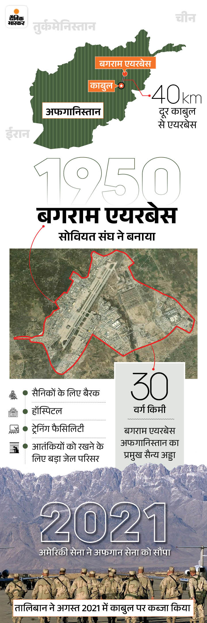 यहां लंबा रनवे, एयर ट्रैफिक कंट्रोल और मरम्मत सुविधाएं थीं। अमेरिका के लड़ाकू विमान, ड्रोन और हेलिकॉप्टर यहीं से उड़ते थे। बगराम में एक बड़ा डिटेंशन सेंटर भी था, जहां आतंकी और संदिग्ध कैद किए जाते थे।