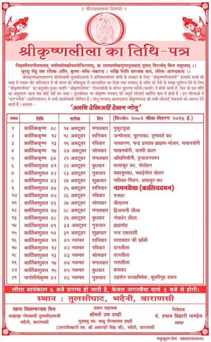 अखाड़ा गोस्वामी तुलसीदास के पीठाधीश्वर महंत विश्वंभर नाथ मिश्र ने स्वयं लीला में भगवान श्रीकृष्ण, बलराम और उनके बाल सखाओं का विधिवत तिलक कर पूजन किया और आरती उतारी। मुकुट पूजन लीला भगवान श्रीकृष्ण की दिव्य लीलाओं का एक प्रतीकात्मक आरंभ है, जिससे कार्तिक मास की लीला परंपरा का शुभारंभ होता है।