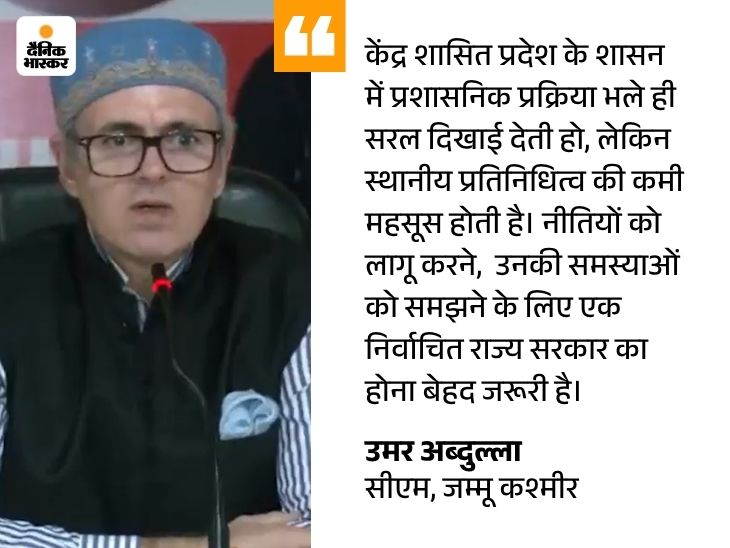 उमर अब्दुल्ला ने सरकार का एक साल पूरा होने पर प्रेस कॉन्फ्रेंस की। उन्होंने मीडिया से कहा कि केंद्र सरकार को अपना कमिटमेंट पूरा करना चाहिए। कहा कि पिछले एक साल में उनकी सरकार ने विकास के काम तेज किए हैं। लेकिन राज्य का दर्जा न होने से कई मुश्किलें आ रही हैं।