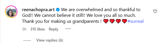 वहीं, परिणीति की मां रीना चोपड़ा ने राघव की पोस्ट पर लिखा, “हम बहुत खुश हैं और भगवान का धन्यवाद करते हैं!! अभी भी विश्वास नहीं हो रहा है!! हम आप सभी से बहुत प्यार करते हैं। नाना-नानी बनाने के लिए धन्यवाद।”