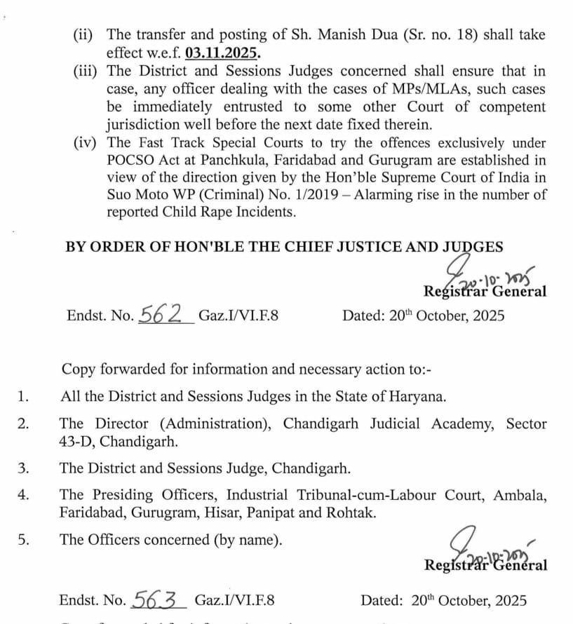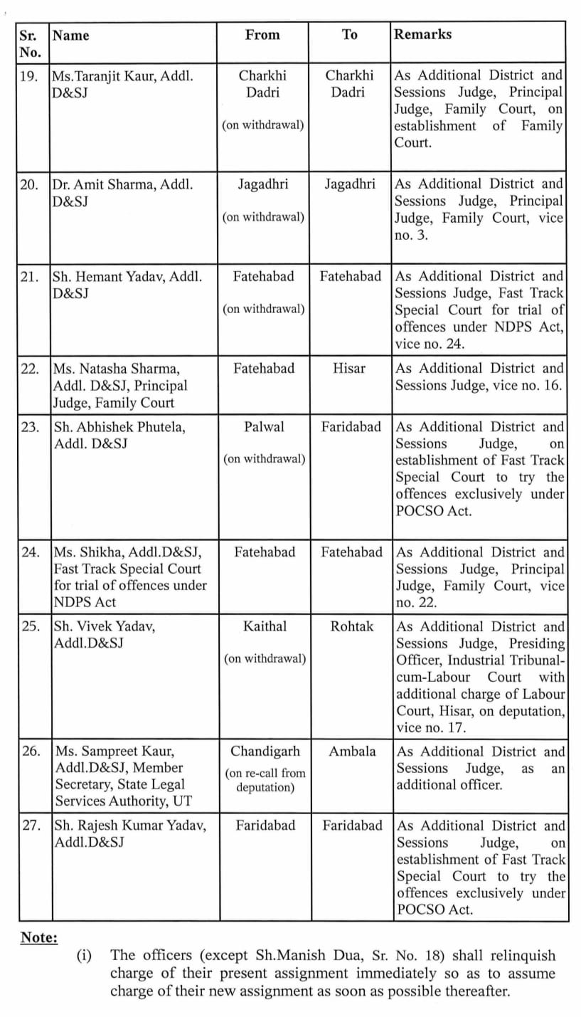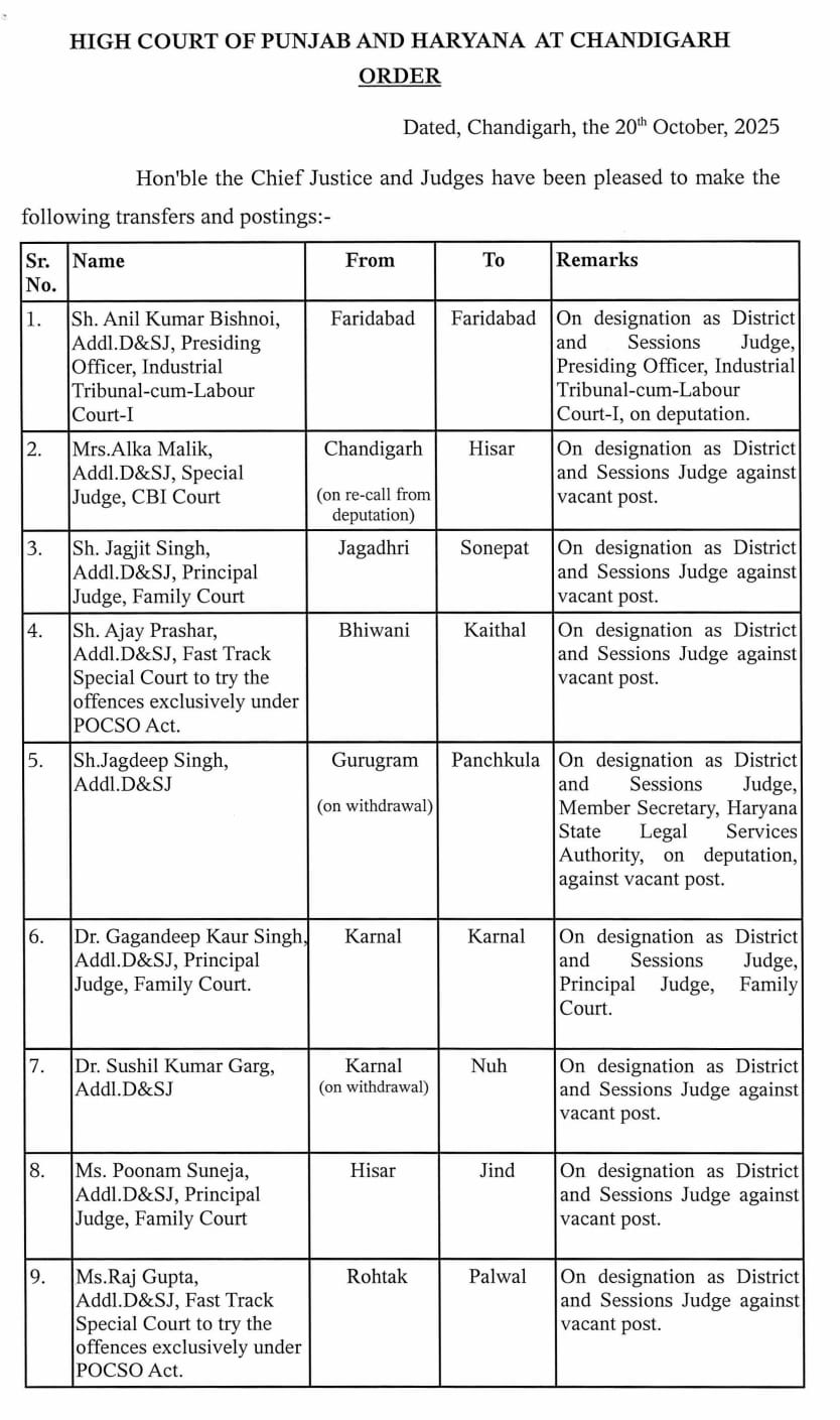 हरियाणा में दिवाली के दिन बड़े स्तर पर जज बदल दिए गए। पंजाब एंड हरियाणा हाईकोर्ट की ओर से जारी ट्रांसफर लिस्ट में 27 न्यायिक अधिकारियों के नाम शामिल हैं।