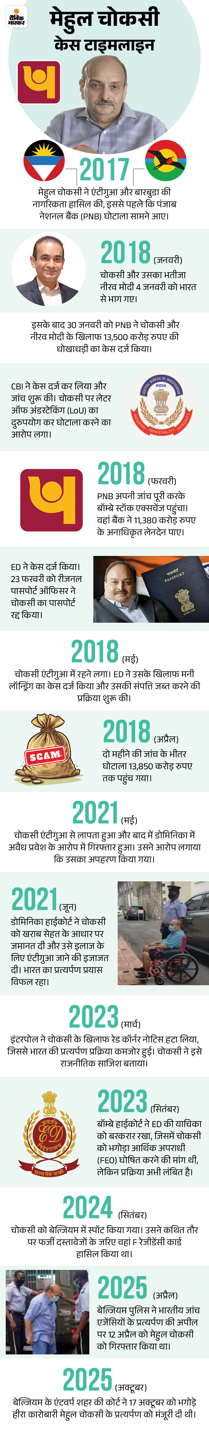 बेल्जियम पुलिस ने भारतीय जांच एजेंसियों के प्रत्यर्पण की अपील पर इसी साल 12 अप्रैल को पंजाब नेशनल बैंक से लोन धोखाधड़ी मामले में आरोपी मेहुल चोकसी को गिरफ्तार किया था। फिलहाल वह जेल में है।