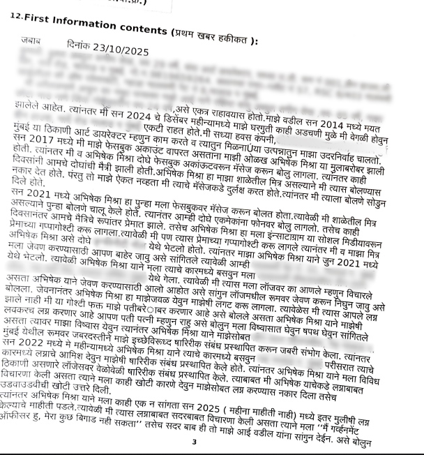 शिकायत के अनुसार, पीड़िता ने आरोप लगाया है कि जून 2021 में अभिषेक मिश्रा ने भोजन के बहाने उसे एक होटल में ले जाकर उसके साथ जबरदस्ती शारीरिक संबंध बनाए। मैंने कहा कि मैं अपनी शादी के लिए ऐसा केवल अपने पति के साथ करूंगी, लेकिन उसने मुझे विश्वास दिलाया कि वह जल्द ही मुझसे शादी करेगा और हम पति-पत्नी के रूप में रहेंगे। इसके बाद उसने लॉज में जबरदस्ती शारीरिक संबंध स्थापित किए।