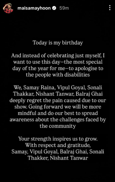 समय रैना ने अपने ऑफिशियल इंस्टाग्राम अकाउंट से स्टोरी पोस्ट कर लिखा है, “आज मेरा बर्थडे है, और सिर्फ अपनी खुशी मनाने के बजाय, मैं इस खास दिन का इस्तेमाल उन लोगों से माफी मांगने के लिए करना चाहता हूं जो दिव्यांग हैं।”