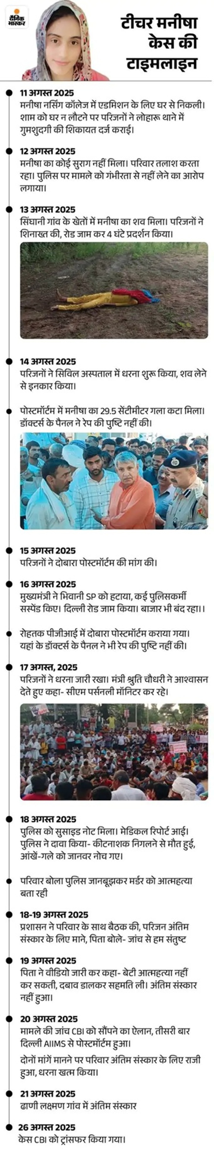 3 सितंबर को पहली बार आई थी सीबीआई CBI की जांच शुरू होने के बाद 3 सितंबर को टीम पहली बाद दिल्ली से भिवानी पहुंची थी। इसके बाद लगातार सीबीआई की टीम जांच में जुटी हुई है। इसी जांच के दौरान CBI की टीम 2 बाद दिल्ली लौट चुकी है। वहीं CBI की टीम फिर से तीसरी बार दिल्ली से भिवानी पहुंची है। CBI की टीम मनीषा मौत मामले की जांच कर रही है।