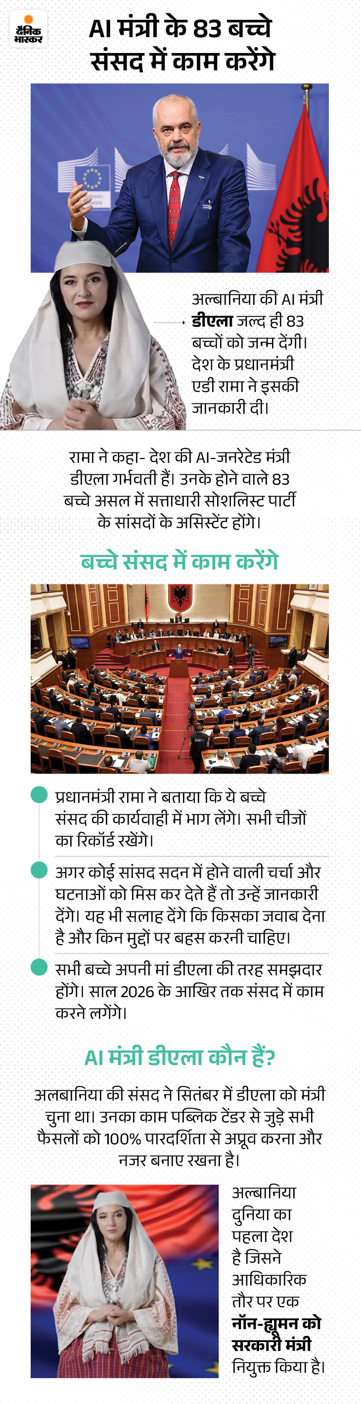 अल्बानिया की AI मंत्री जल्द ही 83 बच्चों को जन्म देगी। सभी बच्चे संसद में काम करेंगे। वहीं, दुनिया के सबसे बड़े फुटबॉल लीग फीफा का मैच आसमान में खेला जाएगा।