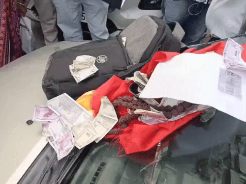 नौसरबाज के बैग में से निकली पोटलियां व चिल्ड्रन बैंक के नोट।