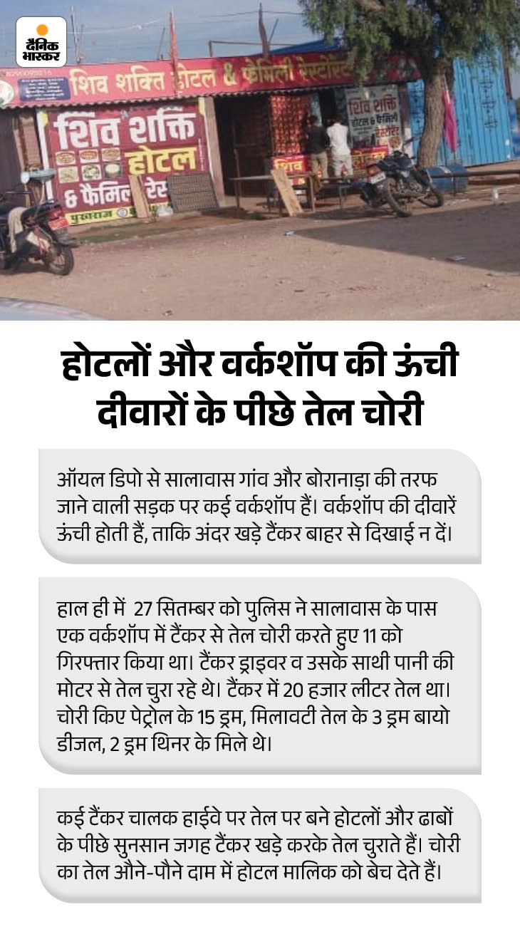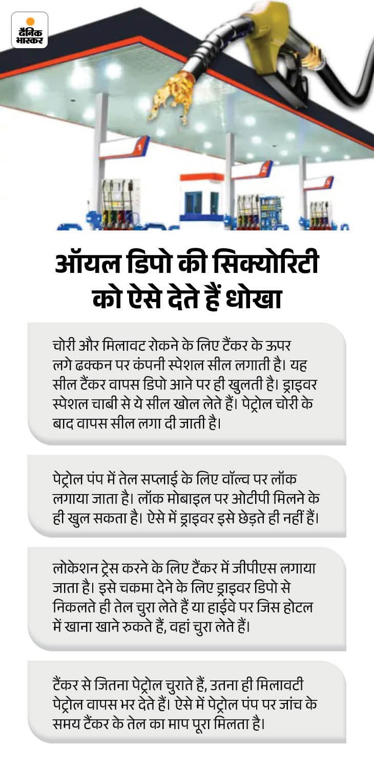 राजस्थान में गैंग टैंकरों से पेट्रोल-डीजल चुरा रही हैं। ऑयल डिपो से रवाना होने के बाद पंप पर पहुंचने से पहले गैंग के बदमाश गैरेज, झाड़ियों या सुनसान रास्तों पर ड्राइवरों की मिलीभगत से महज 15-20 मिनट में हजारों लीटर पेट्रोल-डीजल चुरा लेते हैं।