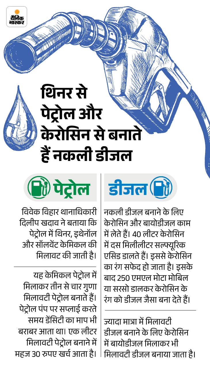 उसकी जगह एथेनॉल, थिनर और केरोसिन तेल मिलाकर तैयार किया 30 रुपए का मिलावटी पेट्रोल-डीजल भर देते हैं। 104 रुपए लीटर का असली पेट्रोल किराणा व्यापारियों और हाईवे पर बने वर्कशॉप को 60 रुपए लीटर के भाव में बेच दिया जाता है।