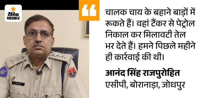 तेल कंपनियां बोलीं- रास्ते में होती है बदमाशी जोधपुर के सालावास स्थित इंडियन ऑयल डीपो के डीजीएम विकास जेना ने बताया कि टैंकर ड्राइवर डिपो से निकलने के बाद रास्ते में बदमाशी करते हैं। टैंकर की सील से छेड़खानी नहीं हो और तेल चोरी को रोकने के लिए हम सील में एडवांस तकनीक से बदलाव करने की तैयारी कर रहे हैं। इसके अलावा तेल चोरी की शिकायत मिलने पर हम टैंकर ड्राइवर को हमेशा के लिए बैन कर करते हैं। तेल चोरी में डिपो के किसी भी कर्मचारी और अधिकारी की मिलीभगत नहीं होती है। यह बहुत पहले होता था। लेकिन बाद में कार्रवाई करके इसे पूरी तरह से बंद कर दिया गया।