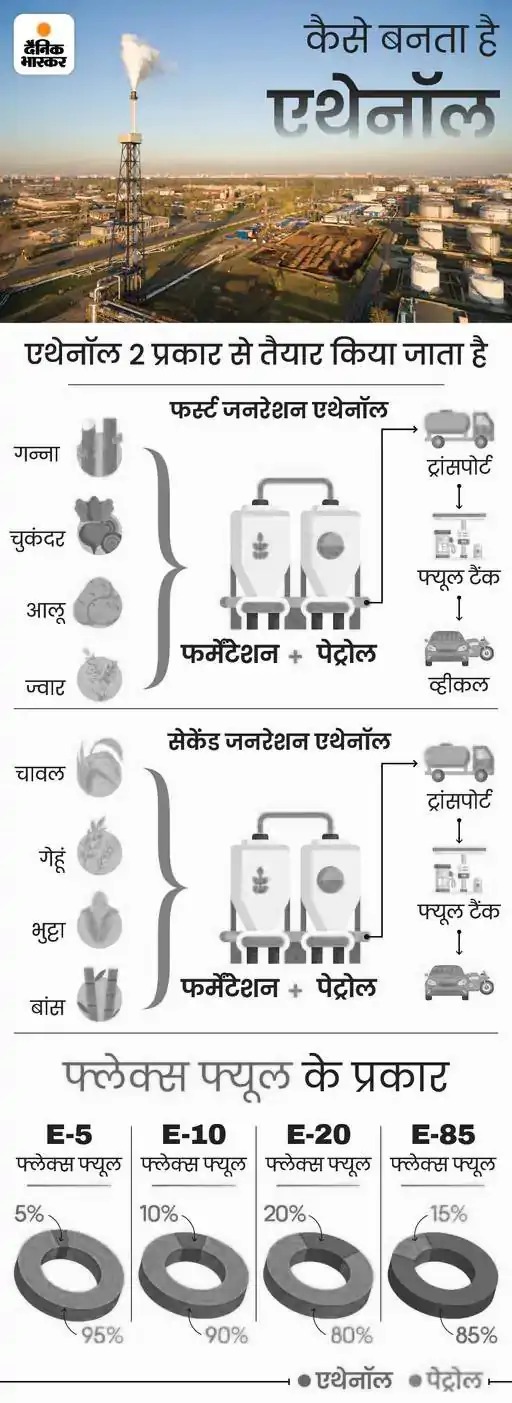 एथेनॉल का उत्पादन मुख्य रूप से गन्ने के रस से होता है। यह एक तरह का अल्कोहल है, जो स्टार्च और शुगर के फरमेंटेशन से बनाया जाता है। इसमें स्टार्च को मक्का, सड़े आलू, कसावा और सब्जियों के फरमेंटेशन से तैयार किया जाता है। शुगर का फरमेंटेशन गन्ने के रस से करते हैं। दोनों के फरमेंटेशन से एथेनॉल तैयार किया जाता है।
