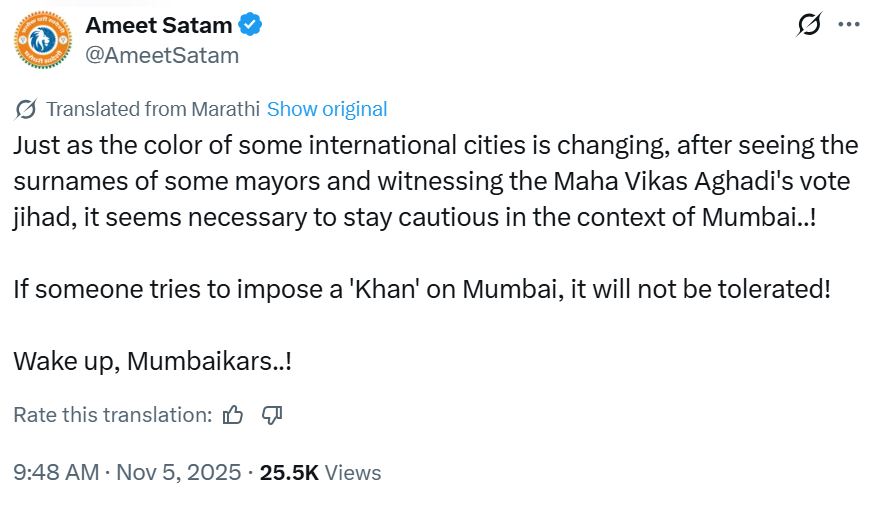 ‘जिस तरह से कुछ अंतरराष्ट्रीय शहरों का राजनीतिक रंग बदल रहा है, कुछ मेयरों के उपनाम और महाविकास अघाड़ी के ‘वोट जिहाद’ को देखते हुए मुंबई को सतर्क रहना जरूरी है। अगर कोई मुंबई पर ‘खान’ थोपने की कोशिश करेगा, तो उसे बर्दाश्त नहीं किया जाएगा! जागो, मुंबईकरों!’