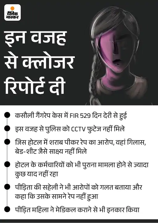 कसौली पुलिस ने दो माह से अधिक समय तक इस केस की जांच की। मगर जांच में साक्ष्य नहीं मिले। पीड़िता ने अपना मेडिकल करवाने से भी इनकार कर दिया था। कई महीनों की देरी से एफआईआर की वजह से पुलिस इस केस में सीसीटीवी, शराब के गिलास, बेड शीट जैसे सबूत नहीं जुटा पाई।