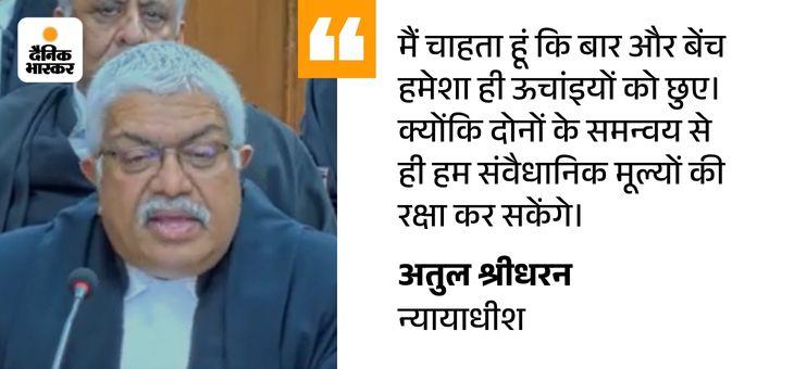 जीवन और पद की अनिश्चितता, क्षणभंगुरता की ओर इशारा इस शेर के माध्यम से उन्होंने जीवन और पद की अनिश्चितता और क्षणभंगुरता की ओर इशारा किया। इससे पहले जस्टिस अतुल श्रीधरन ने कहा कि मैं चीफ जस्टिस का धन्यवाद करता हूं, कि उनकी वजह से मैं यहां पर अच्छा समय गुजार पाया। चीफ जस्टिस संजीव सचदेवा जी, बहुत ही नम्र व्यक्ति हैं, और सभी से तालमेल बनाकर चलते हैं।