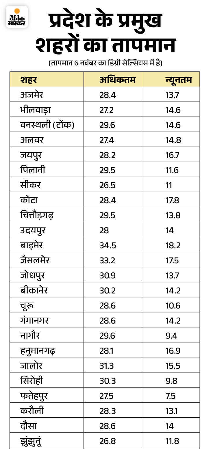सभी शहरों में पारा 20 डिग्री से नीचे आया गुरुवार इस सीजन में पहली बार ऐसा हुआ, जब सभी शहरों में न्यूनतम तापमान 20 डिग्री सेल्सियस से नीचे दर्ज हुआ। बाड़मेर में न्यूनतम तापमान 18.2, जैसलमेर में 17.5, फलोदी में 18.2, जोधपुर में 13.7, बीकानेर, गंगानगर में 14.2-14.2, उदयपुर में 14, सीकर में 11, पिलानी में 11.6, जयपुर में 16.7, अजमेर में 13.7, कोटा में 17.8 और अलवर में 14.8 डिग्री सेल्सियस दर्ज हुआ।
