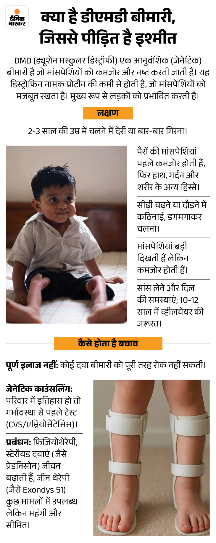 - चार साल का था इश्मीत, तब बीमारी डिटेक्ट हुई : जंडियाला गुरु के रहने वाली प्रिया ने बताया कि वो बैंक में नौकरी करती थी। उनका बेटा इश्मीत जब चार साल का हुआ तो अचानक उसे मस्कुलर प्रोब्लम होने लगी। बच्चे को चेक करवाया। कई टेस्ट करवाए फिर पता लगा कि यह डीएमडी नाम की बीमारी से ग्रस्त हो गया हे। जिसका देश में इलाज नहीं है। उन्होंने बताया कि बच्चे की केयर के लिए उन्होंने जॉब छोड़ी।