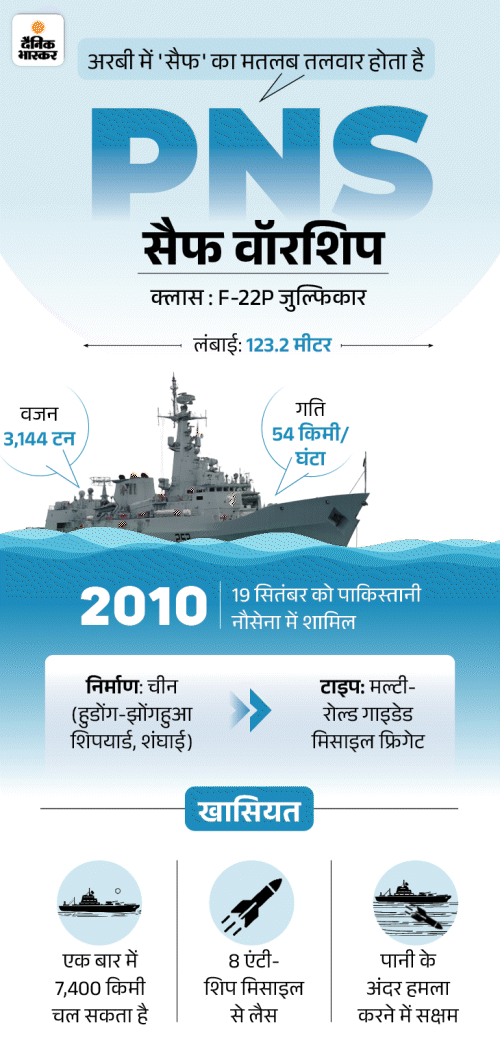 PNS सैफ को चीन ने 2010 में पाकिस्तान को बेचा था। यह वही फ्रिगेट क्लास का जहाज है जिसमें PNS शामशीर और PNS आसलत भी शामिल हैं। रिपोर्ट्स में कहा गया है कि इन दोनों जहाजों में भी इसी तरह की तकनीकी समस्याएं सामने आई हैं।