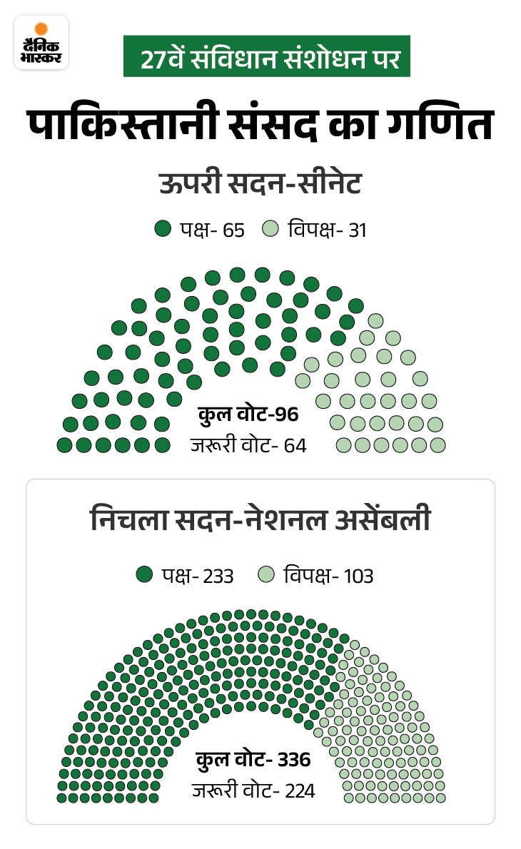 पाकिस्तान की संसद ने बुधवार को आर्मी चीफ आसिम मुनीर की शक्तियों को बढ़ाने और सुप्रीम कोर्ट के ताकत को कम करने वाले 27वें संवैधानिक संशोधन को मंजूरी दे दी। पाकिस्तानी ऑब्जर्वर की रिपोर्ट के मुताबिक, इस संशोधन में 48 आर्टिकल में बदलाव का प्रस्ताव दिया गया है।
