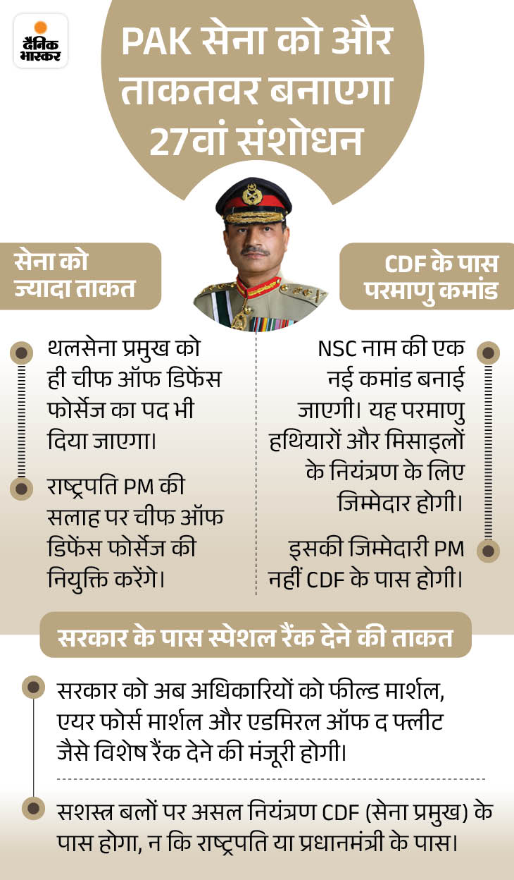 मुनीर को तीनों सेनाओं का चीफ ऑफ डिफेंस फोर्सेज (CDF) बनाया जा रहा है। यह 27 नवंबर 2025 से लागू हो जाएगा। पद मिलते ही उन्हें परमाणु हथियारों की कमांड मिल जाएगी। अपना कार्यकाल पूरा होने के बाद भी वह अपने पद पर बने रहेंगे और उन्हें आजीवन कानूनी छूट मिलती रहेगी।