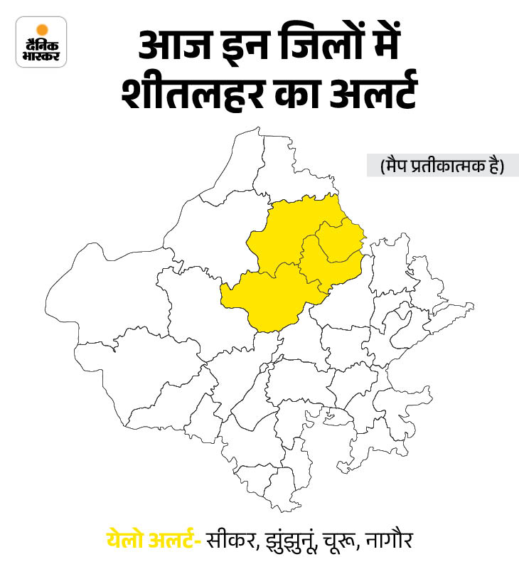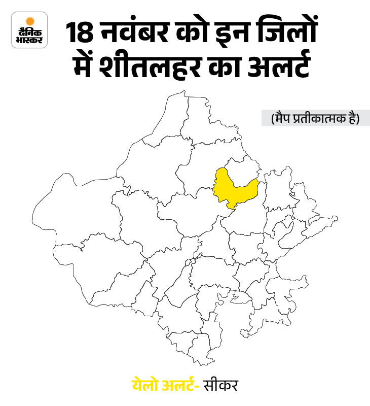 मौसम विज्ञान केन्द्र जयपुर की ओर से 17 नवंबर को सीकर, झुंझुनूं, चूरू, नागौर जिलों में कोल्ड-वेव चलने का येलो अलर्ट जारी किया है। वहीं 18 नवंबर को सीकर के लिए येलो अलर्ट जारी किया है। मौसम विशेषज्ञों ने बताया- राज्य में आगामी एक सप्ताह मौसम शुष्क रहेगा और उत्तरी हवाओं के कारण सर्दी से कोई राहत मिलने की उम्मीद नहीं है।