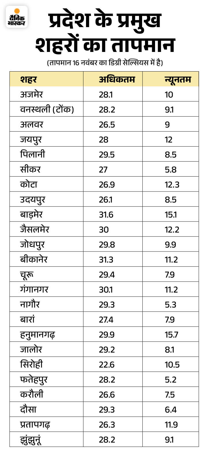 जयपुर में न्यूनतम तापमान 12 डिग्री सेल्सियस, अजमेर में 10, भीलवाड़ा में 9, वनस्थली (टोंक) में 9.1, अलवर में 9, पिलानी में 8.5, चूरू में 7.9, जालोर में 8.1, करौली में 7.6, दौसा में 6.4, बाड़मेर में 15.1, जैसलमेर में 12.2, कोटा में 12.3, बीकानेर, गंगानगर में 11.2 और झुंझुनूं में 9.1 डिग्री सेल्सियस दर्ज हुआ।